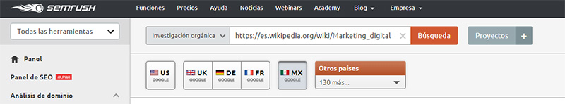 Ejemplo: En este blog unos de los temas que tocamos es el marketing digital use Semrush para buscar la entrada de Marketing Digital en WordPress: